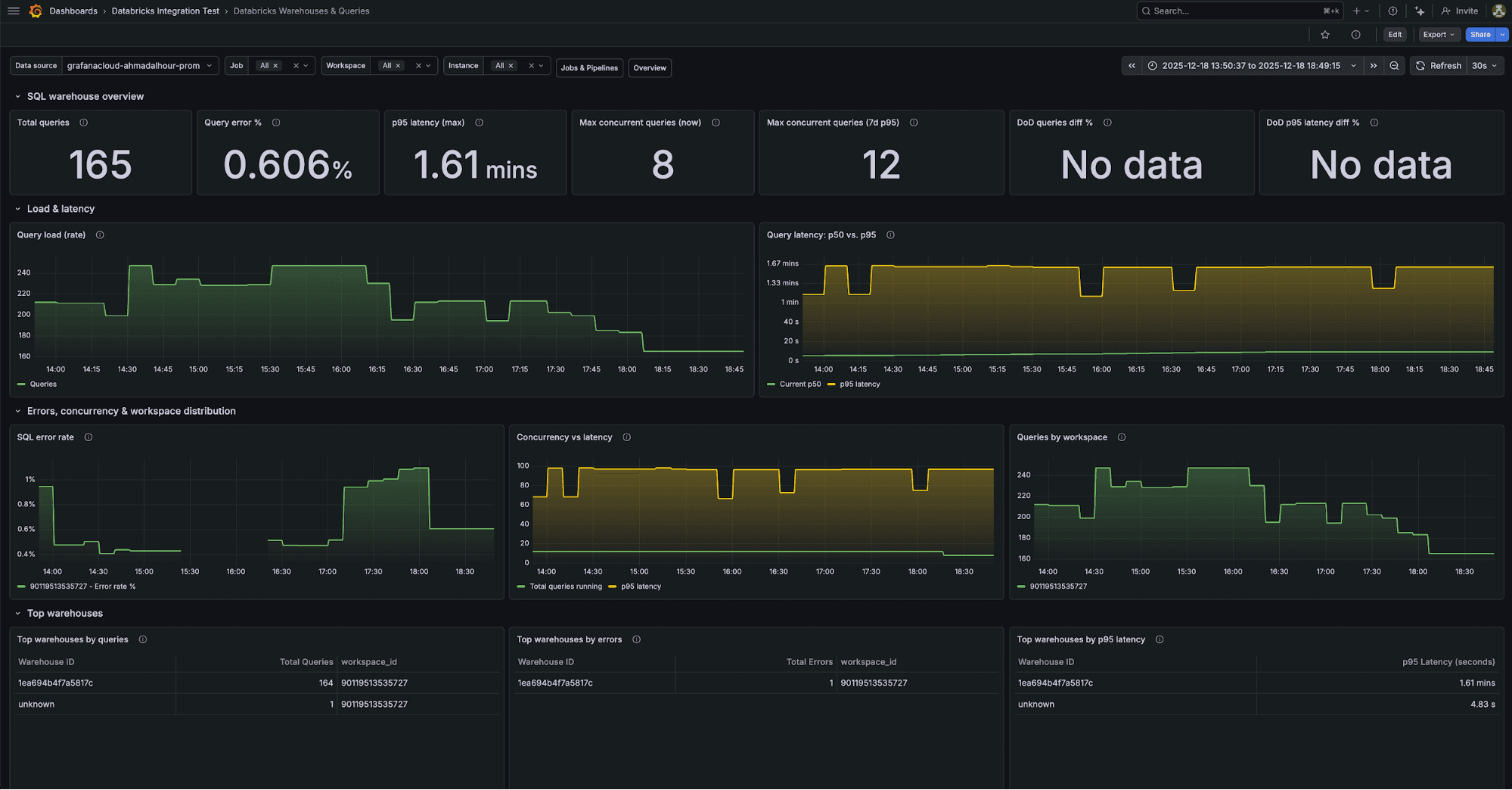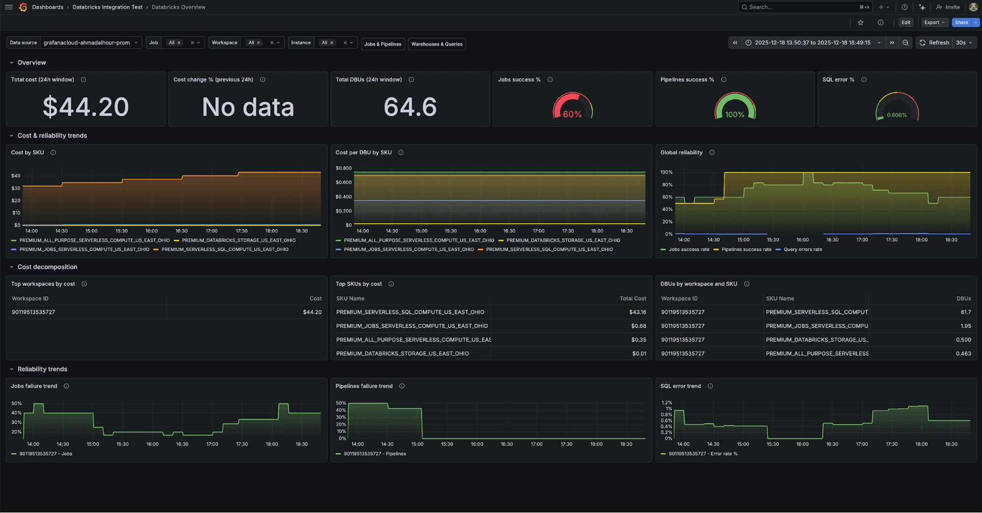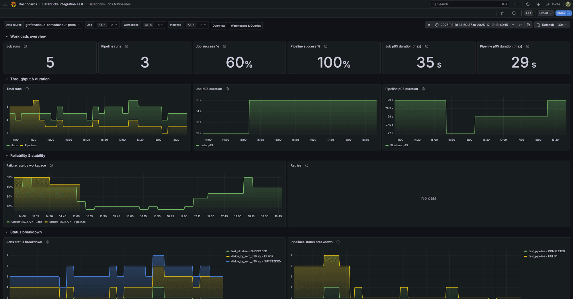 With this integration, you can pull metrics from your Databricks workspaces directly into Grafana Cloud—no custom exporters to manage, no dashboards to build from scratch. You get visibility into billing, job reliability, and SQL warehouse performance all in one place.