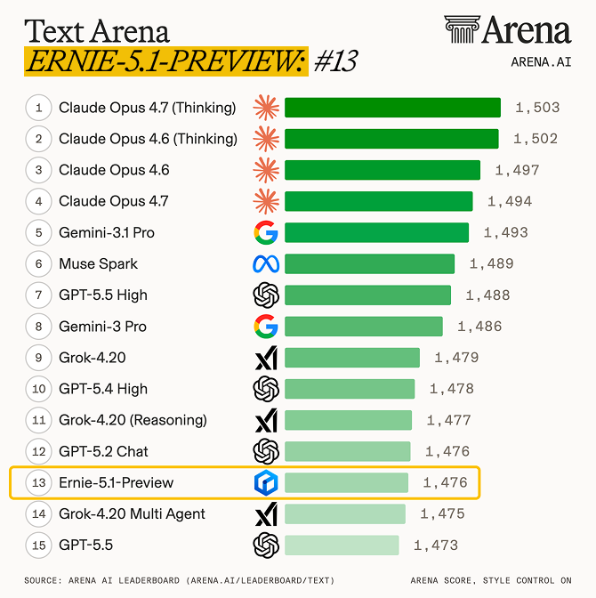 ERNIE-5.1 from @ErnieforDevs lands at #13 in Text Arena — now the #1 highest-ranked model from a Chinese lab.