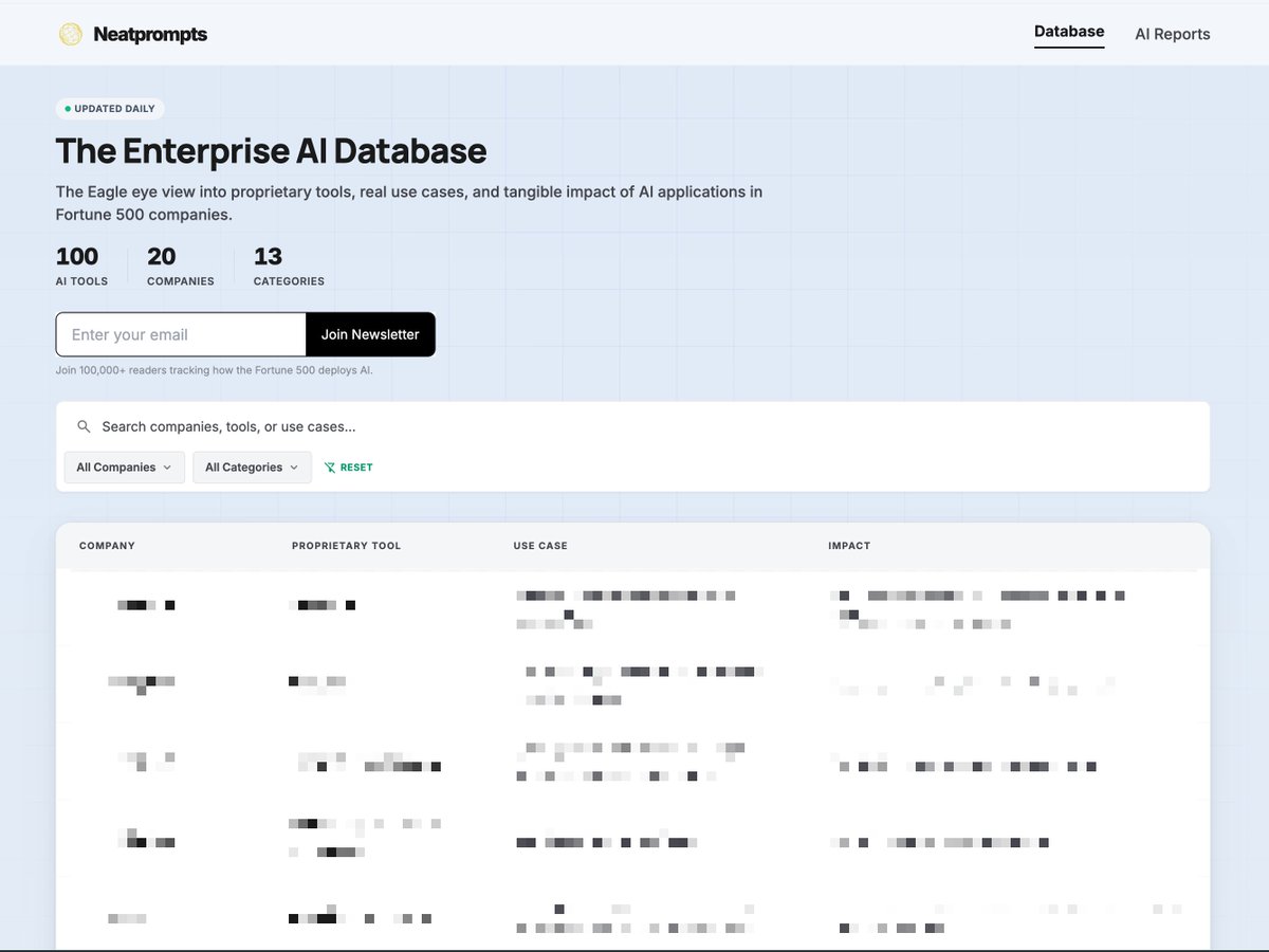 We're building a database of how F500 companies use AI. 100 tools across 20 companies and 13 categories so far. Every entry shows the company, the proprietary tool they built, the use case, and the actual business impact. We've been publishing 1 report per week on companies like McKinsey, Coca Cola and Intel: https://neatprompts.com/ai-at-the-top Thought it might be useful to turn all of this into something interactive that people can search through, filter, and actually use to build the case for AI inside their own companies. Not sure where this is heading. No idea how it makes money yet. But if you want to try it out I'd love feedback.