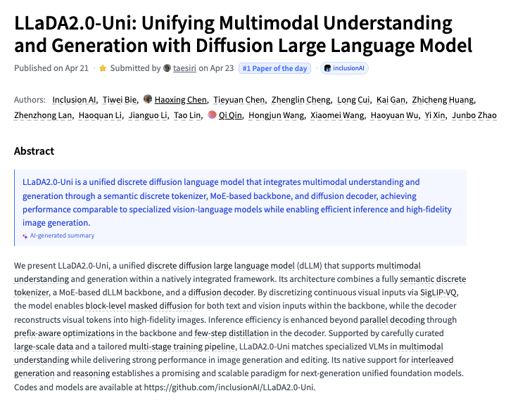 LLaDA2.0-Uni Unifying Multimodal Understanding and Generation with Diffusion Large Language Model paper: huggingface.co/papers/2604.20
