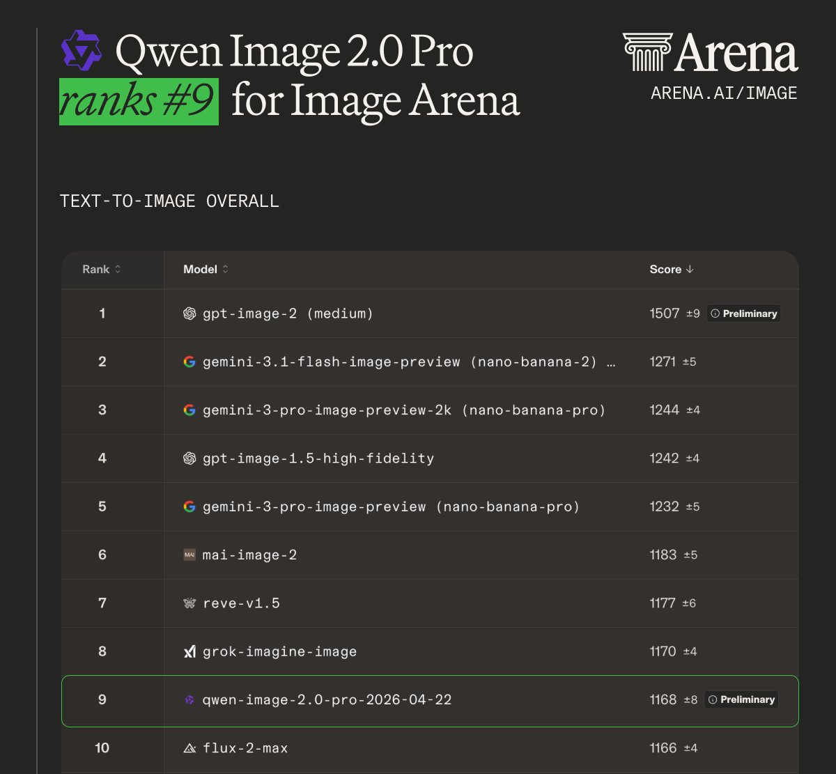 Arena.ai on X: "Qwen Image 2.0 Pro 2026-04-22 lands at #9 in Text-to-Image Arena. Highlights of the latest image model from @Alibaba_Qwen: - #9 Text-to-Image - #17 Image Edit (Single Image) Top 10 in Text-to-Image categories: - #6 Portraits - #7 Photorealistic & Cinematic Imagery - #7 Art https://t.co/DKmOr45ZTj" / X