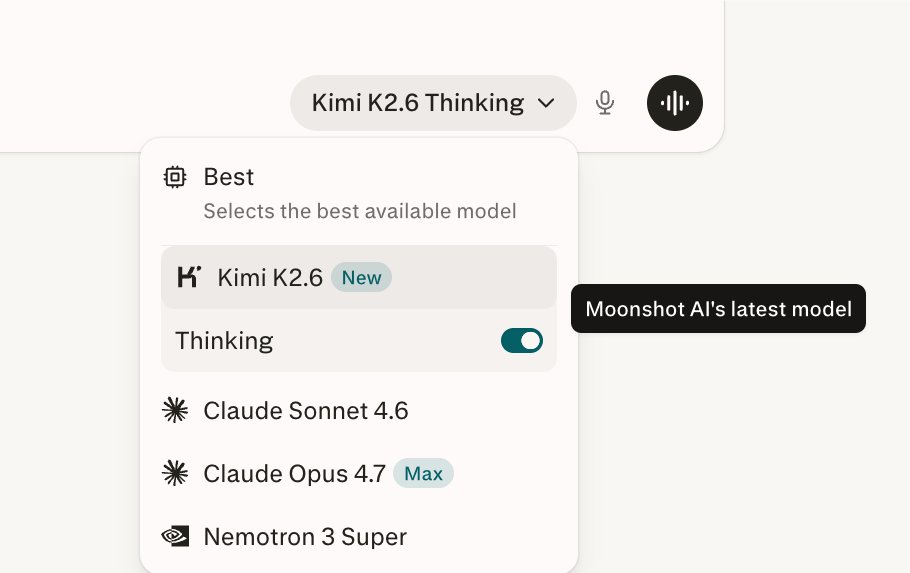 Kimi K2.6, the new state-of-the-art open-weight model from Moonshot, is now available for Pro and Max subscribers.