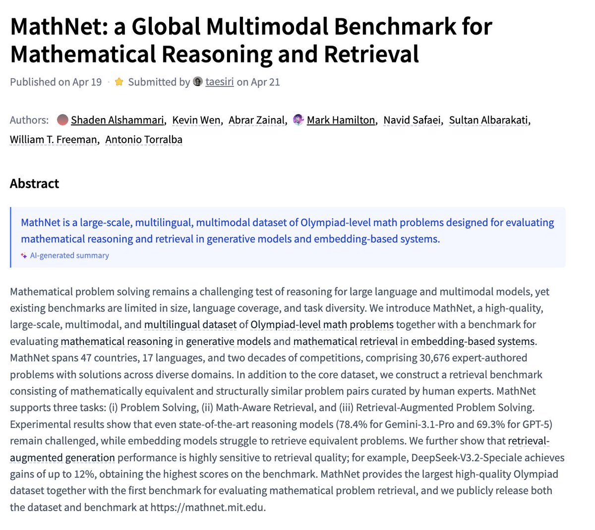 - 推文未解释MathNet的架构、数据集或评估指标。