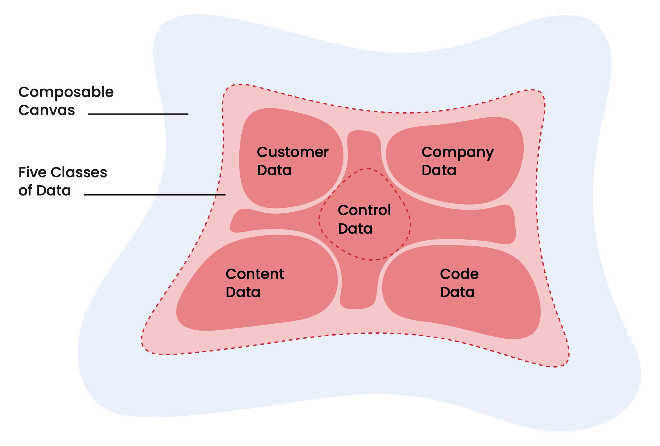 The report describes five classes of data converging on the unified foundation: customer data, company data, content data, code data, and control data. Customer data: "individual and account profiles, transaction histories, behavioral signals (web visits, product usage)" sits at the heart of it all.