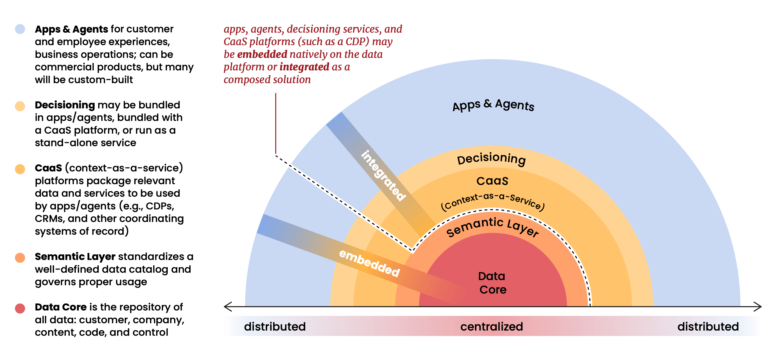 The report's core structural argument is that the data platform (Databricks, Snowflake, BigQuery, etc.) has become the gravitational center of the entire martech stack. Applications, agents, and analytics no longer sit on top of the data; they operate within it. The data platform isn't a repository at the bottom of the stack anymore._It is the stack._