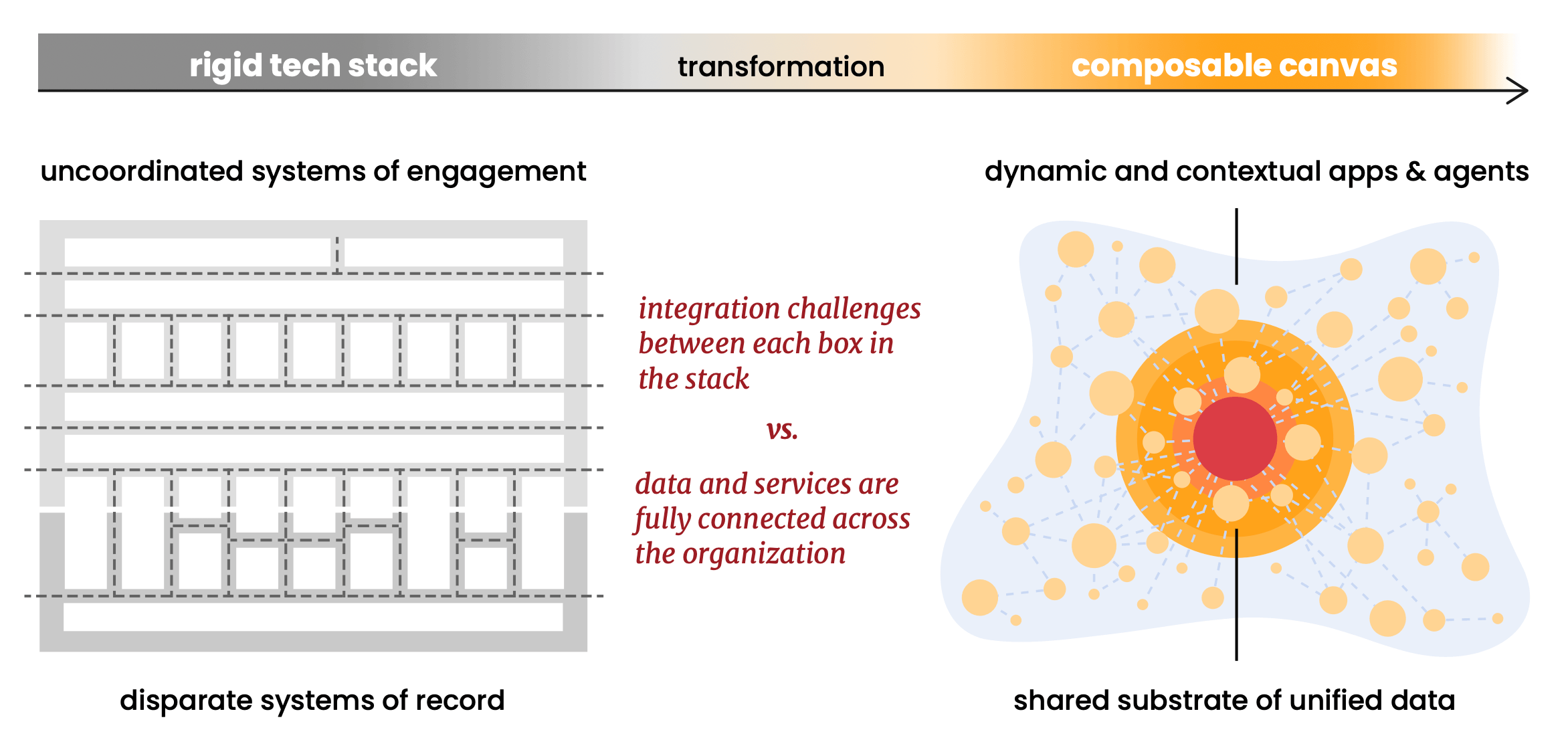 Scott Brinker's new report with Databricks articulates something I've been watching take shape for years: the martech "stack", the familiar Tetris arrangement of boxes, is beginning to dissolve. What's emerging in its place is what Scott calls a composable canvas: a fluid, data-centric architecture where AI agents and custom software operate on shared data rather than fighting through integration pipelines.