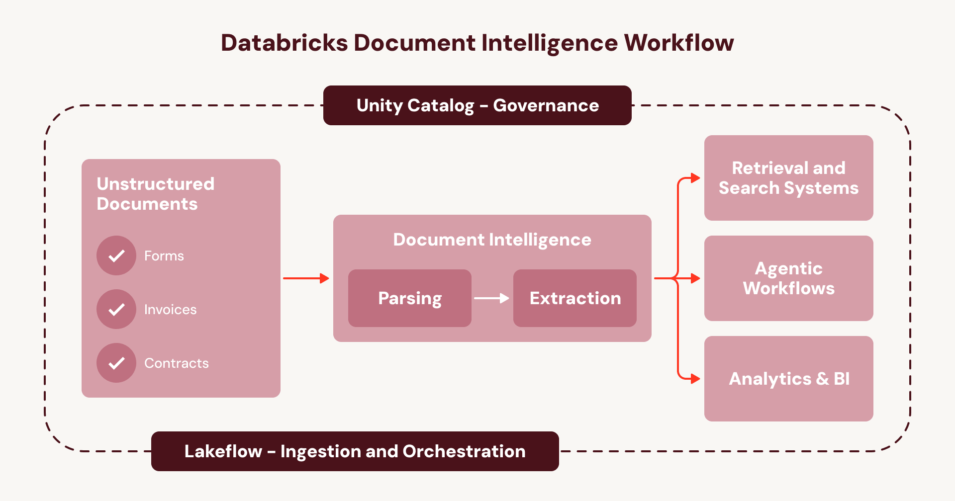 This is the cycle that keeps document intelligence trapped as a series of one-off projects instead of an enterprise-wide capability. Document Intelligence breaks that cycle. Instead of stitching together disconnected services, every step runs natively inside your existing Databricks orchestration and governance layer: