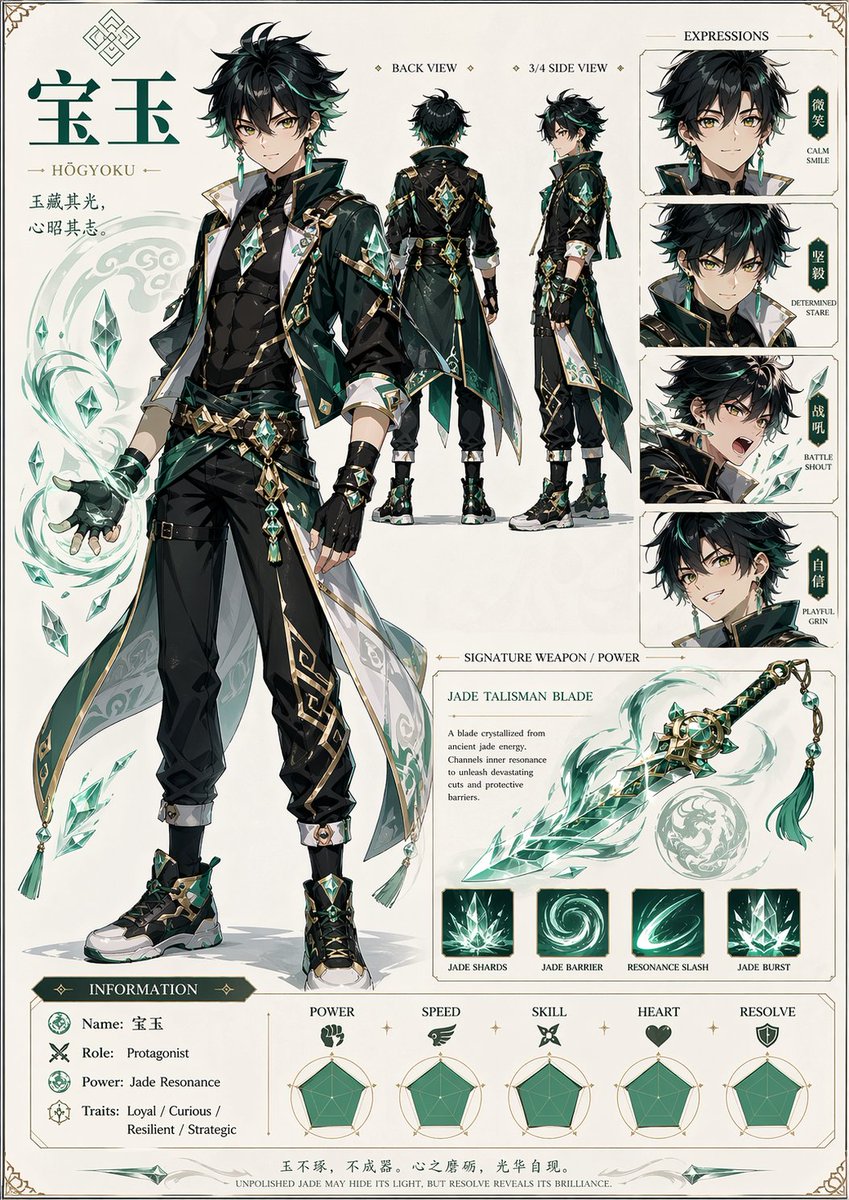 Based on everything you know about me, make a character sheet of shonen-style anime character of me, name is 宝玉 https://t.co/6x0DHb2MCQ" / X