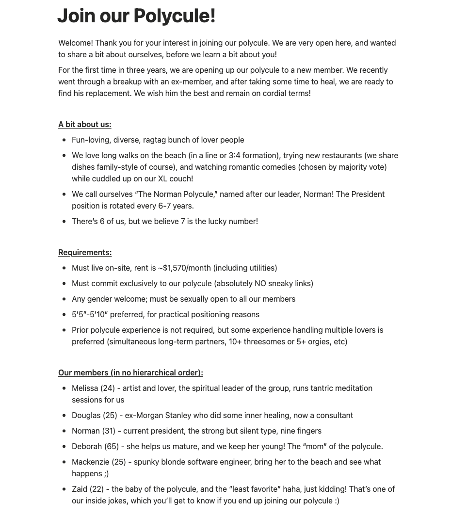 Completely inaccurate depiction of SF polycules. There's not a single mention of AI safety, LessWrong, or shrimp welfare in this giant Notion doc.