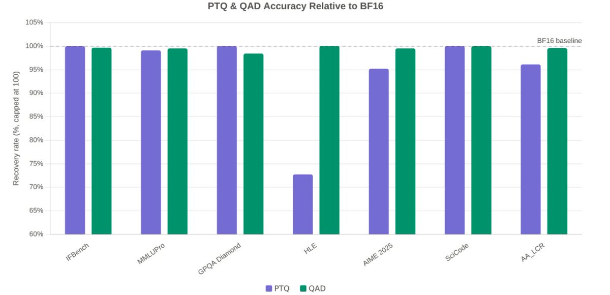 - 引入量化感知蒸馏(QAD)匹配BF16模型质量。