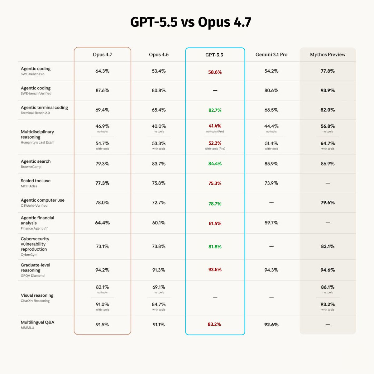 gpt5.5 vs opus4.7 真正的对比图 coding 还是弱了