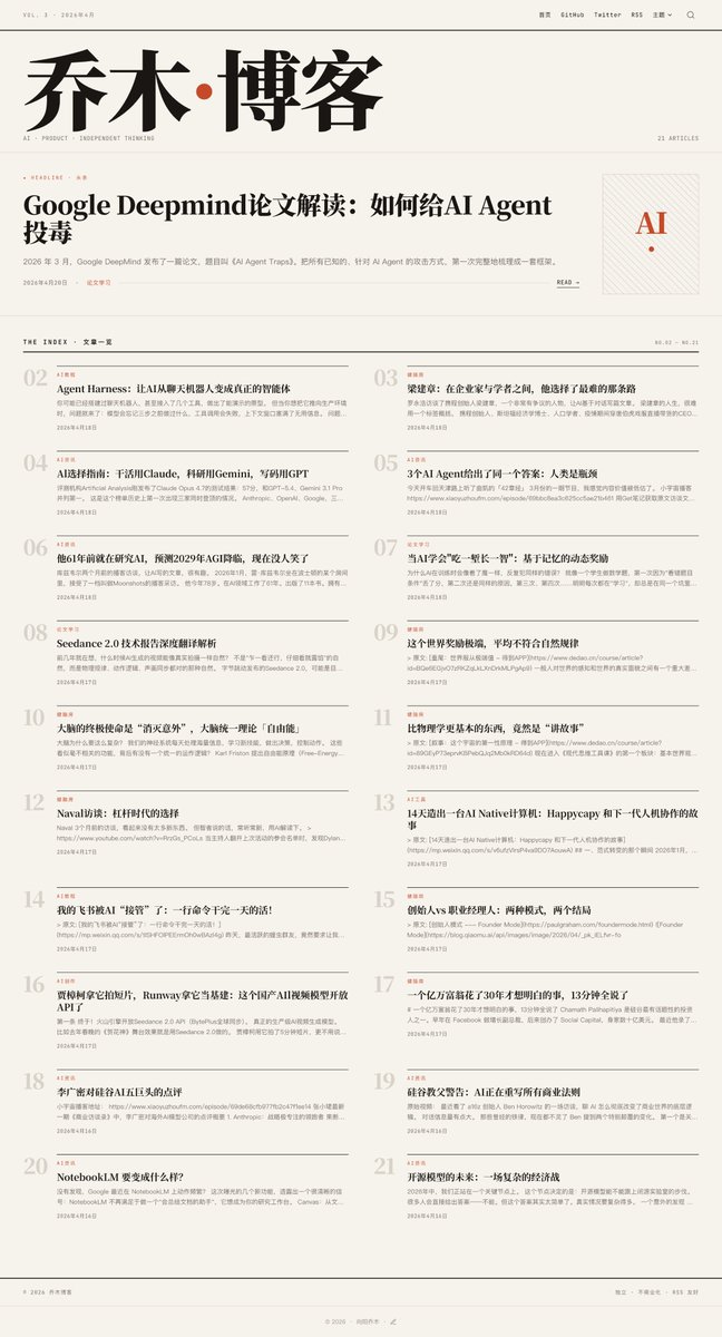 昨天很多朋友反馈乔木博客文本看不清。 后来才意识到Mac的深色模式,兼容性不够。 让Codex修好了,其中一款主题的PC和移动显示效果如下。 为测试我也开了深色模式,发现很难受。 调研下,有多...