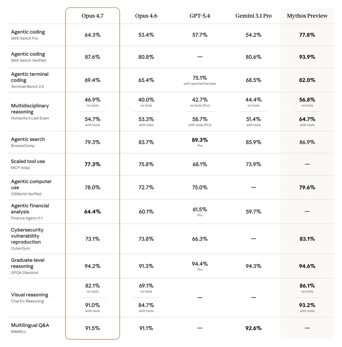 - Opus 4.7在SWE-Bench Pro和Verified等基准测试中得分大幅提升。