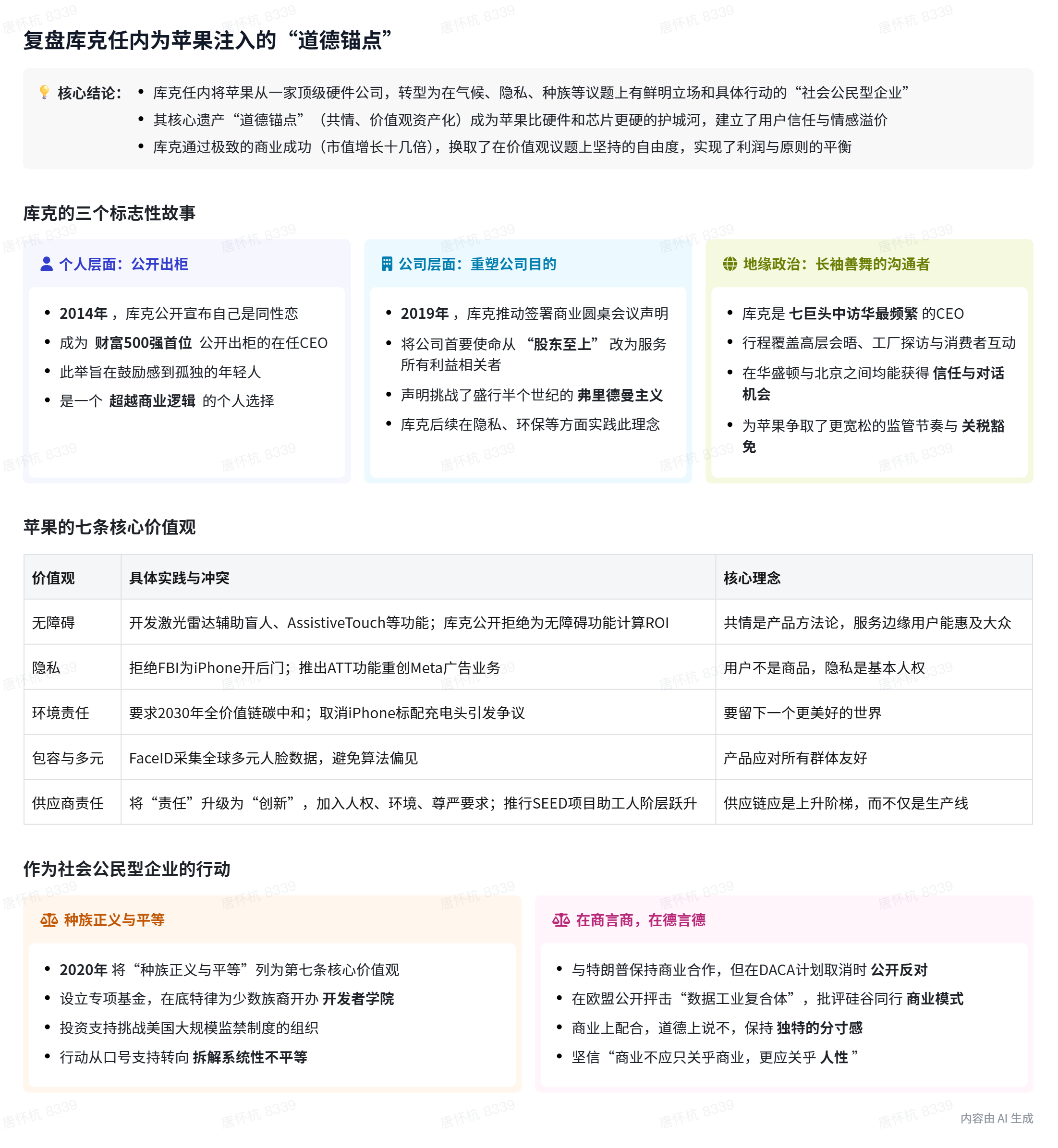 - 库克通过隐私保护、无障碍设计等六条价值观重塑了苹果的道德锚点。